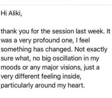Hi Aliki - I just wanted to give you some feed back on our sessions. First off I just want to say thank you on the amazing work you are doing. I’ll be forever grateful. I’m not sure where to start with all the transformations I’ve been going through since meeting you in late March 2018.